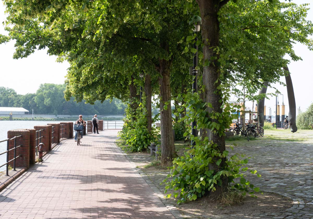 Buntes Treiben am Fähranleger und auf dem Wasser sowie historische Schiffe im Museumshaven. Eine bronzene Wal-Schwanzflosse, ein Walkiefer am Utkiek, der "Vegesacker Junge" und der Ausblick von der Seilzugbrücke sind weitere Highlights in Vegesack.